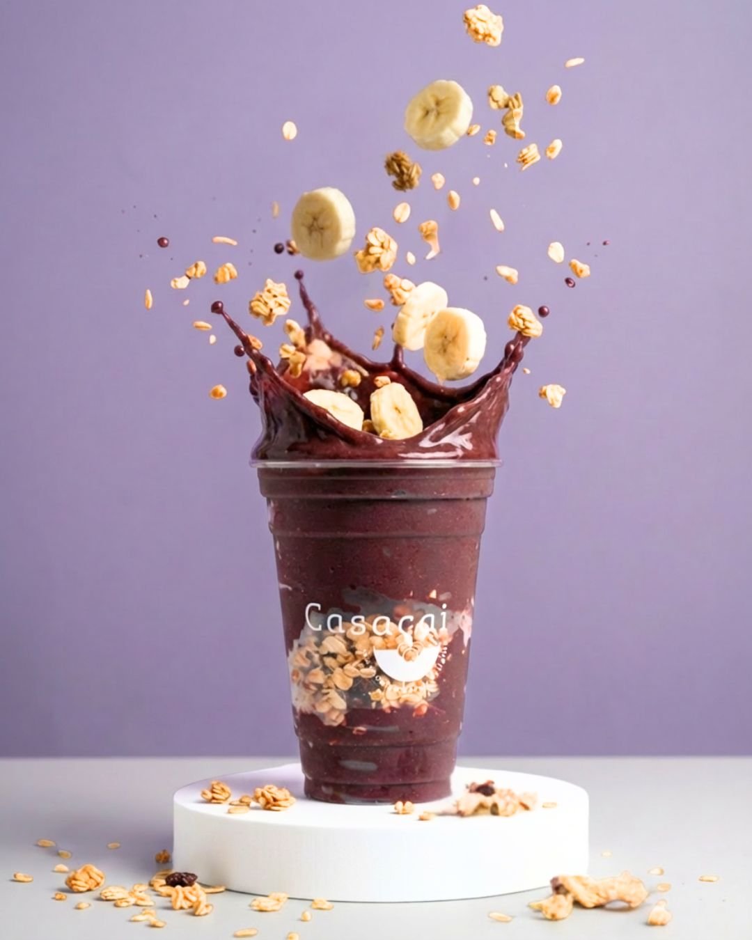 Organik Brezilya Açaisi, Yer Fıstıklı & Çikolatalı Granola, Whey Protein, Muz, Çilek, Hindistan Cevizi Sütü Veya Badem Sütü